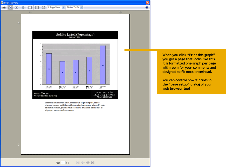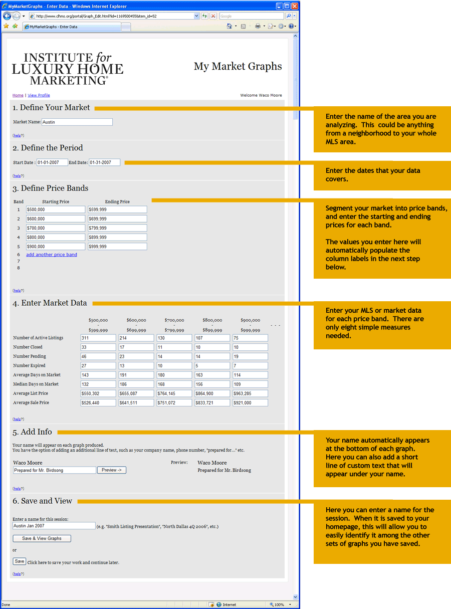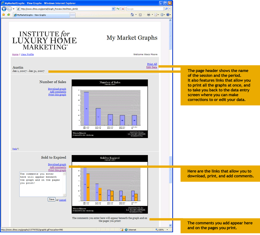 After you enter you data and click "Save and View Graphs" (above) the system automatically generates all the graphs and displays them on this screen. Here you can download, print and add comments to any and all of the graphs.