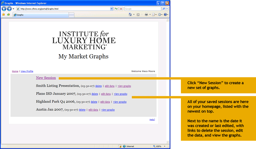 It features a simple list of all of your saved "sessions"--the graphs you have created and the data you have entered.